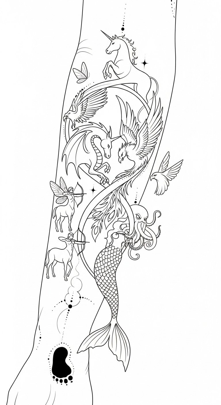 This tattoo concept layers mythic motifs to symbolize balance between strength and rebirth, innocence and mystery; the entwined dragon and phoenix represent cyclical transformation, the unicorn and fairy wings evoke purity and wonder, while the mermaid tail and kraken tentacle hint at hidden depths. The griffin and centaur add guardianship and skill, the chimera and yeti footprint suggest confronting inner beasts and embracing the unknown. Placed along the wrist flowing to the forearm, the vertical arrangement allows each element to read individually up close and form a cohesive narrative from a distance, conveying personal freedom and an ongoing journey.