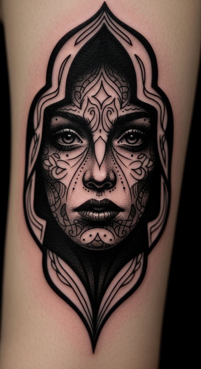 Ideal placement is over the chest or upper arm where natural contours enhance facial detail; lighting effects in the tattoo should follow body curvature to maintain realism.