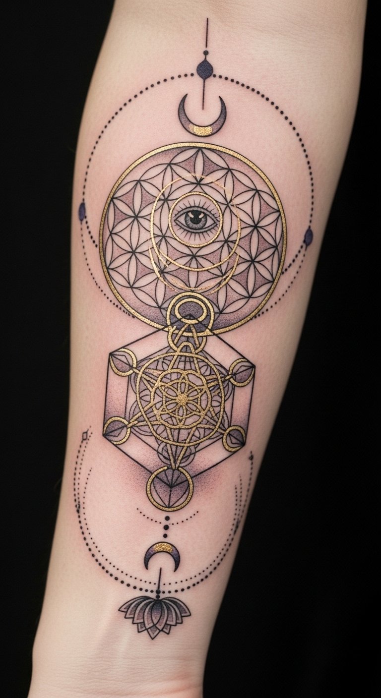 These designs serve as reminders of your spiritual awakening and universal connection, guiding you toward inner peace through the beauty of mystical practices. The combined symbols evoke harmony (sacred geometry), intuition (third-eye), renewal (lotus), and cyclical balance (crescent moon), creating an emotionally grounding and uplifting talisman; ideal placement along the inner forearm or upper shoulder allows visibility for personal reflection and layering into a sleeve for expanding symbolism.