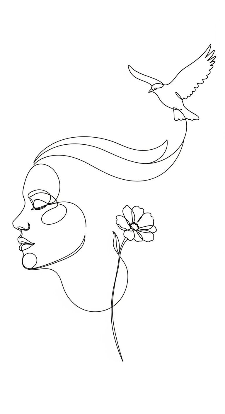 This tattoo design concept uses a continuous flowing line to form an abstract silhouette—perhaps a face merging into a hand or a single vine that subtly becomes a bird—placed where its gentle curve follows the body’s natural lines, such as the forearm, clavicle, or along the rib. The unbroken stroke symbolizes unity and the continuity of personal story, evoking calm, introspection, and creative freedom; its minimalist elegance allows intimate or visible placement depending on how openly you wish to share that narrative.