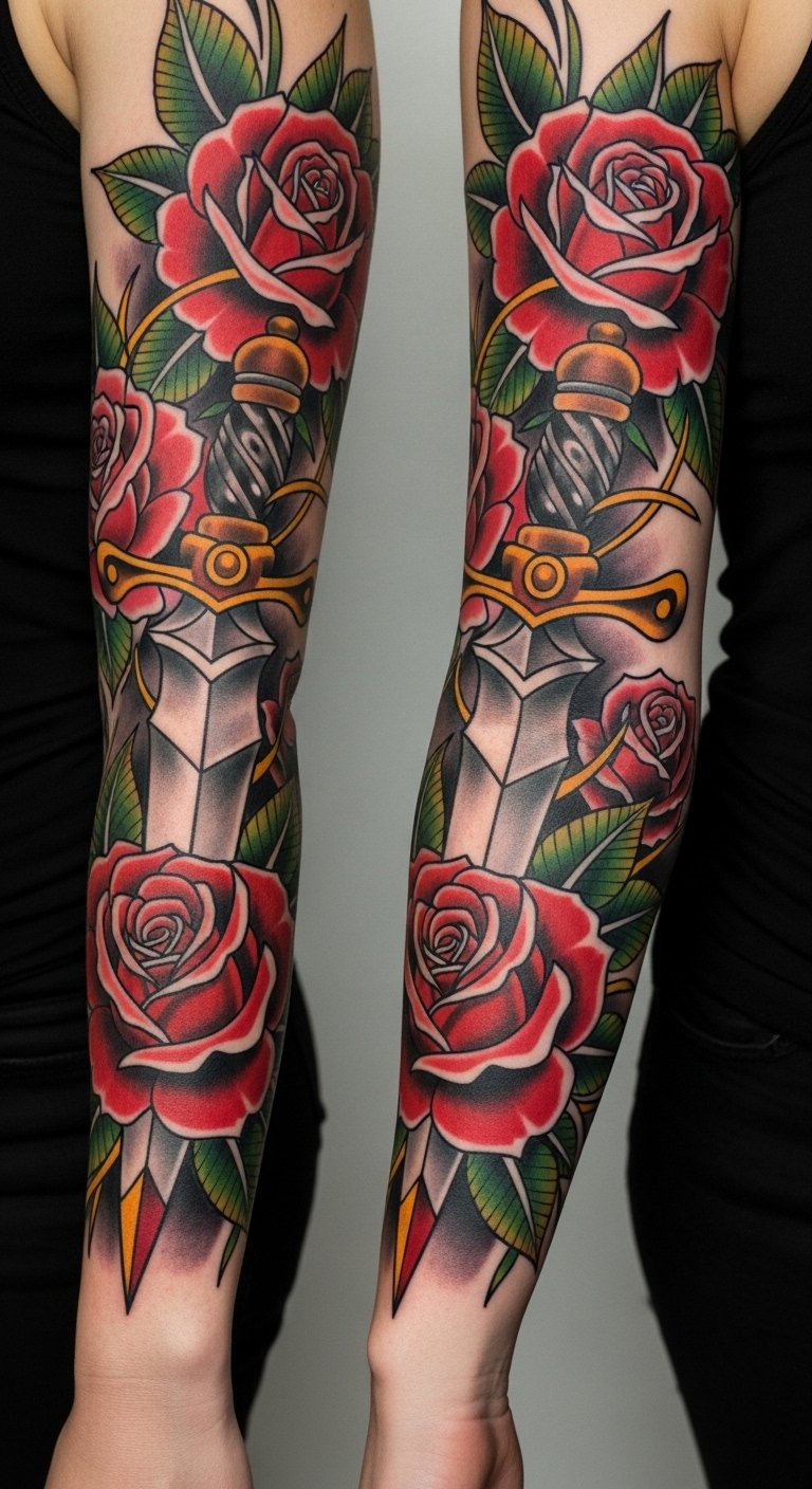 When placed as a sleeve, the rose and dagger composition wraps the arm in a visual narrative of protection and passion: deep reds and velvety blacks for the roses contrast with metallic grays and subtle highlights on the dagger, while touches of teal and gold accent leaves and background filigree to create depth and modern flair.