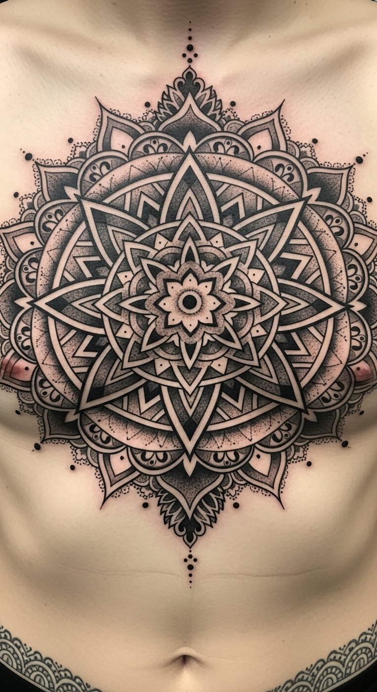 The sternum placement centers the design over the heart, symbolizing inner harmony and protection; the radial expansion across shoulder blades conveys strength and openness, while the lace borders soften intensity to evoke grace—overall the piece aims to inspire calm confidence and a grounding connection to self.