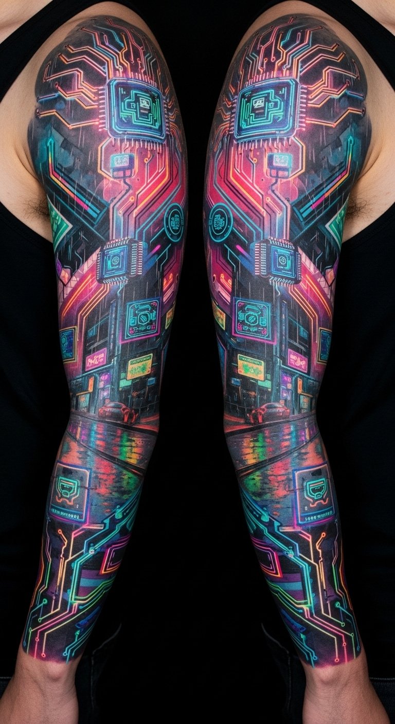 While embracing the electrifying pulse of urban life, cyberpunk circuitry and neon aesthetics transform your sleeve tattoo into a vibrant homage to the future.