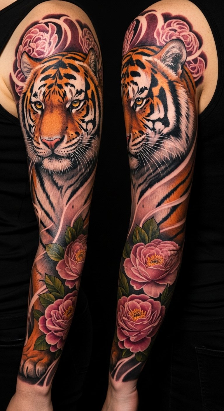 Harnessing the tiger’s power and the delicate language of flowers, this sleeve design balances strength and vulnerability: the tiger’s gaze centered on the upper arm, muscles and fur rendered with photorealistic detail, while trailing peonies, chrysanthemums, and lotus blossoms weave around limbs to soften edges and guide the eye.