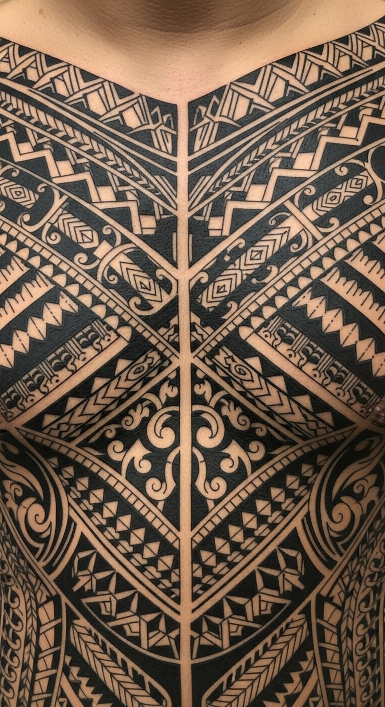 This design concept centers on bold, interlocking Polynesian motifs—wave patterns for life’s journey, spearheads for courage, and concentric family symbols—arranged to flow with the body’s musculature.