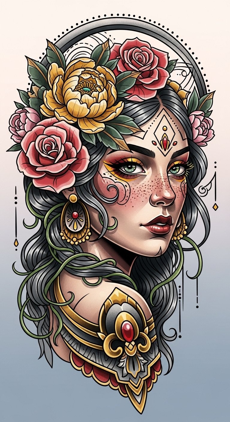 Bringing a vibrant energy to the world of body art, women’s faces in neo-traditional tattoos capture the essence of strength and beauty with striking detail.