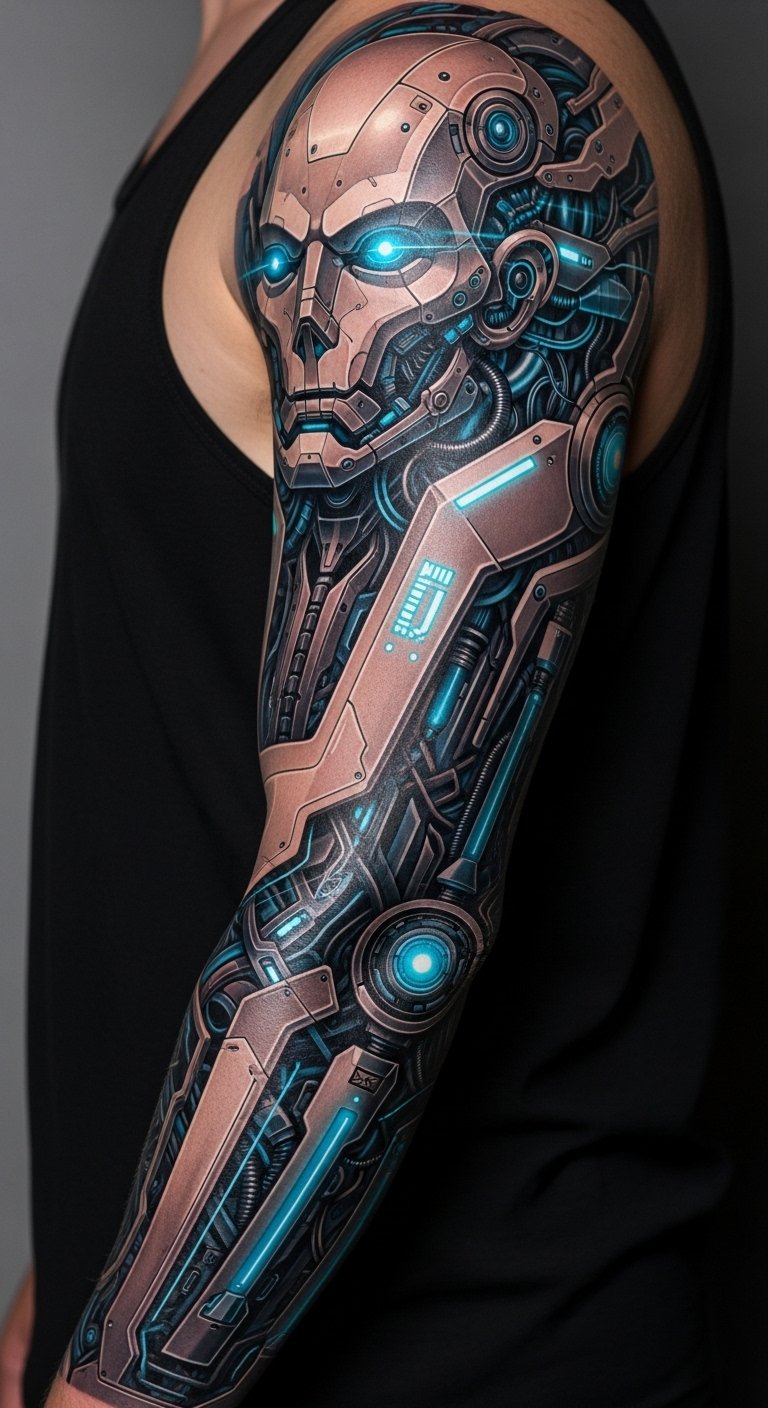 This sleeve design blends flowing biomechanical lines with articulated robotic plates, LED-like filaments, and subtle AR markers to create a sense of living machinery beneath the skin; placed on the arm from shoulder to wrist it follows muscle contours so that movement animates the pieces, evoking resilience, transformation, and a hopeful union of human and machine while inviting curiosity and conversation.