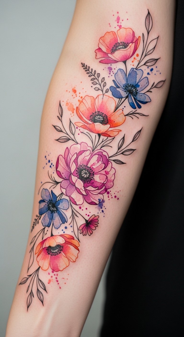 Utilizing watercolor techniques, these tattoos embrace an ethereal quality, transforming your style beautifully and effortlessly. This design emphasizes emotional openness and personal growth—place along the forearm or shoulder blade to let the flowing composition follow the natural lines of the body, allowing the colors to shimmer subtly with movement and to symbolize ongoing renewal and gentle resilience.
