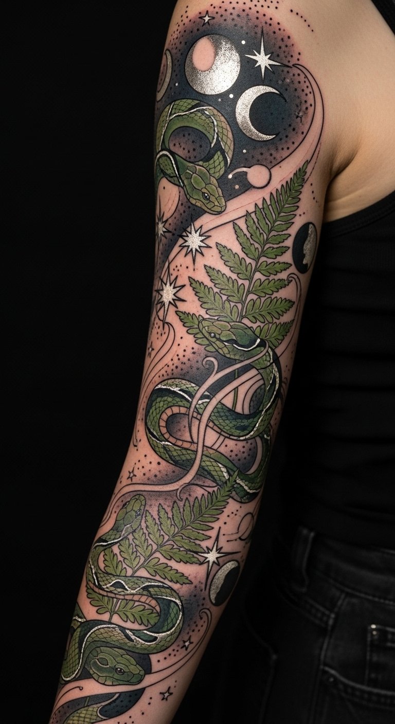 How can the enchanting interplay of celestial elements, snakes, and ferns elevate your sleeve tattoo into a tapestry of nature and mystique?
