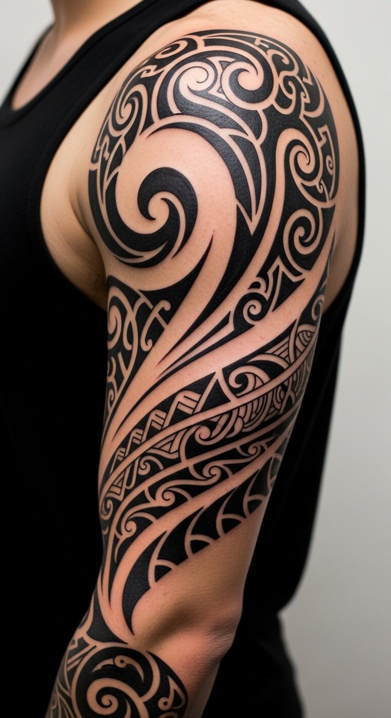 This design marries traditional Maori motifs—koru spirals, manaia guardians, and kano patterns—with sweeping, kinetic lines and negative-space currents to evoke motion across the upper arm and shoulder.