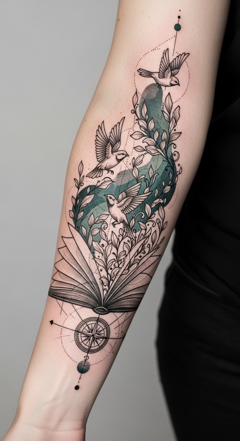 This design ties those ideas together: the open book symbolizes personal history and knowledge, the birds represent transformation and outward expression, the compass denotes guidance and values, and the botanical filigree evokes growth; placed to follow the forearm’s natural lines, it balances visibility and intimacy, aiming to evoke curiosity, pride, and a contemplative confidence when viewed.