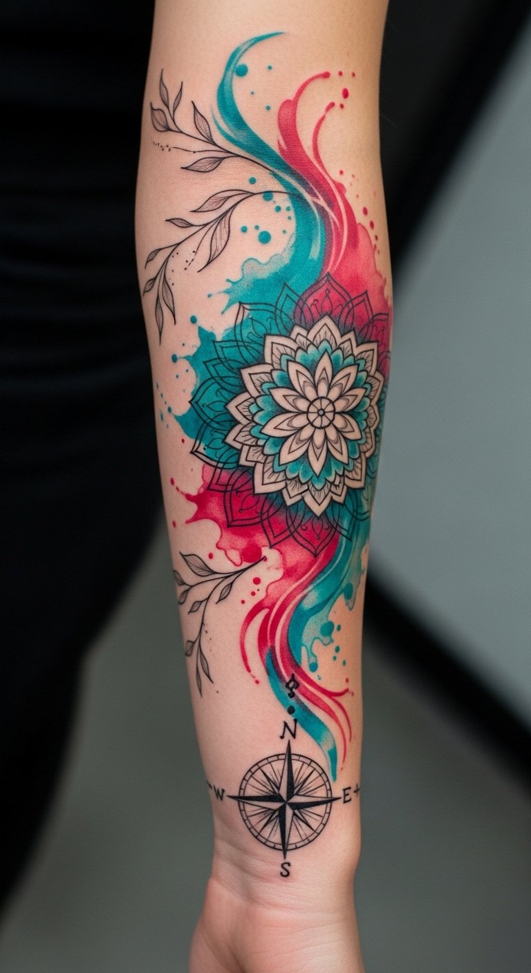 This design symbolizes balance and direction through the mandala and compass, while the watercolor splashes convey passion and fluidity; the botanical vines represent growth and resilience.