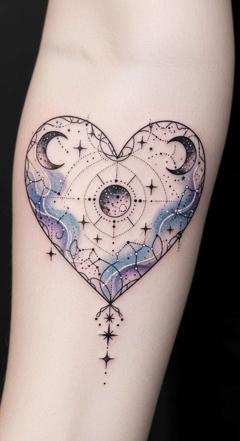 Embracing cosmic alignment, these tattoos weave intricate starlit patterns and moonlit motifs, embodying celestial symbolism. Each heart reflects your unique journey, allowing you to express love and freedom while celebrating the universe’s boundless magic.