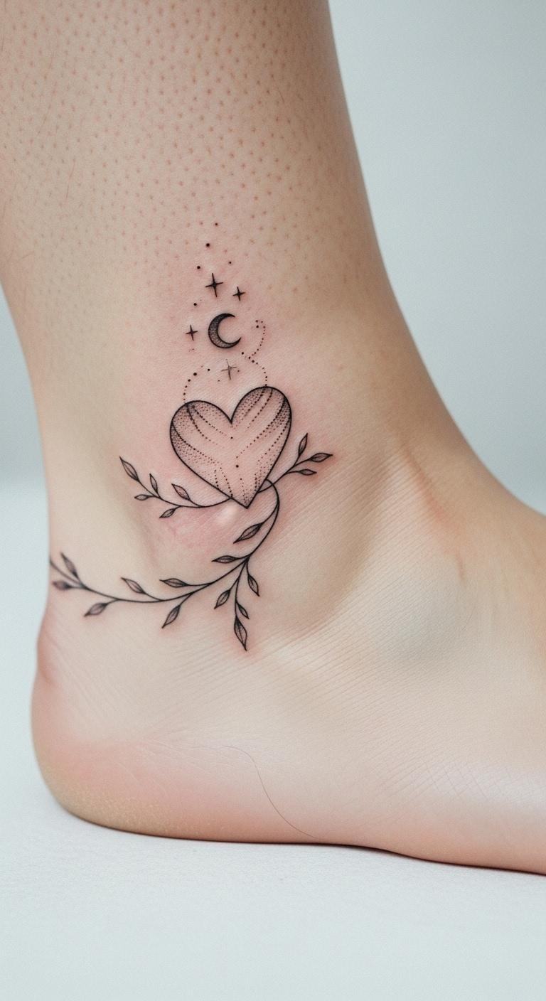 The ankle placement creates a canvas for discreet tattoos that whisper your passions. Each design, whether a tiny heart or a cosmic blend, captures love’s essence, allowing you to carry your emotions freely and intimately wherever you go.