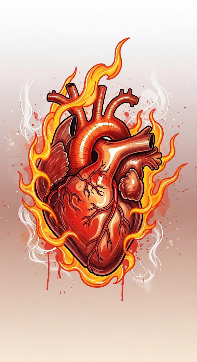 This design symbolizes intense, consuming love and resilience—the realistic anatomy grounds it in life while the flames express transformation, desire, and protection. Emotionally bold and uplifting, it suits the chest over the actual heart for personal meaning, the inner forearm or shoulder blade for visibility, or the ribs for a private, intimate placement.