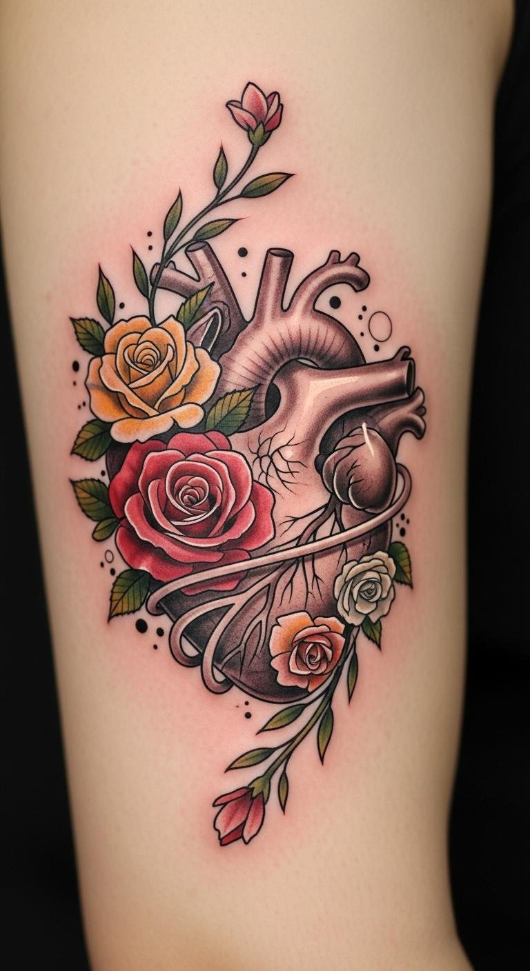 A heart-shaped core cradled by roses and winding vines, rendered in rich reds and soft greens with fine-line detailing and subtle watercolor washes; small buds and leaves trail outward to suggest movement, with optional tiny thorns for contrast—ideal for a chest center, upper arm wrap, or ribcage placement to follow the body’s contours.