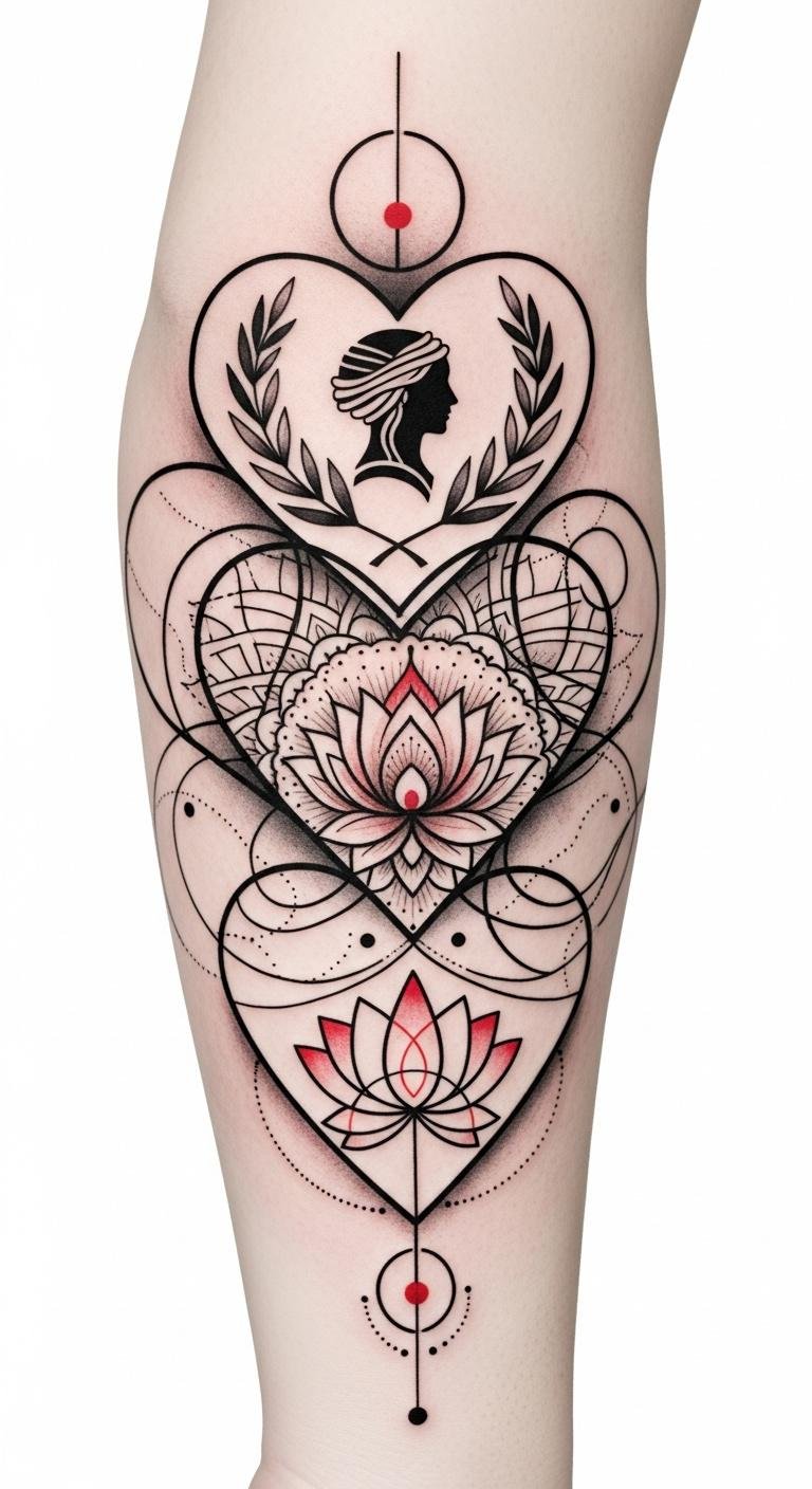 This tattoo concept weaves those narratives into a cohesive piece: placement on the forearm or upper back makes it visible yet intimate, the layered motifs symbolize multifaceted identity and relationships, dotwork and fine lines evoke tenderness and precision, red highlights accentuate passion, and the option for personal elements allows the wearer to express individual emotion and heritage.