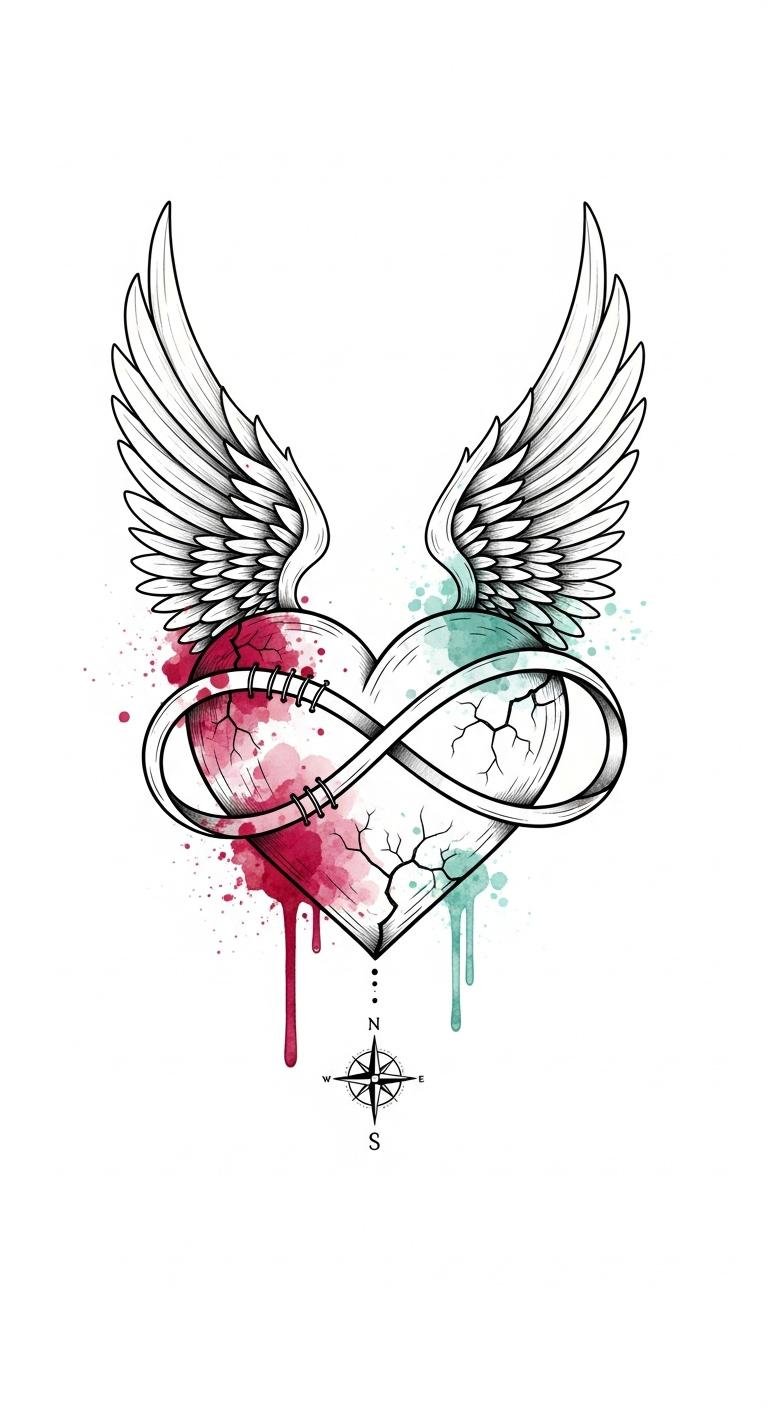 This tattoo concept layers meaning: the infinity loop signifies enduring love and continuity, wings suggest liberation and ascension, the mended cracks evoke healing and resilience, and the compass anchors the piece as a reminder of personal direction.
