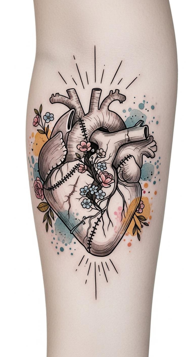 Let this inked art narrate your past while inspiring freedom and hope for the future. The stitched seam and blooming flowers symbolize repair and new life rising from wounds, the watercolor washes evoke the ebb and flow of feeling, while the scar textures and light rays express endurance and emerging hope; ideal placement on the inner forearm allows personal visibility for reflection and discreet concealment when needed.