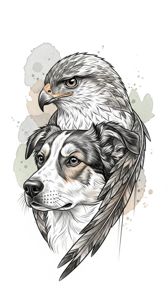 With such artistry, you’ll wear a piece of freedom that speaks your heart’s language. The dog symbolizes loyalty and homeward love while the hawk represents vision and freedom; placing this design on the inner forearm or upper shoulder keeps it visible for personal connection yet easy to cover, evoking both protection and aspiration with subdued emotional intensity.