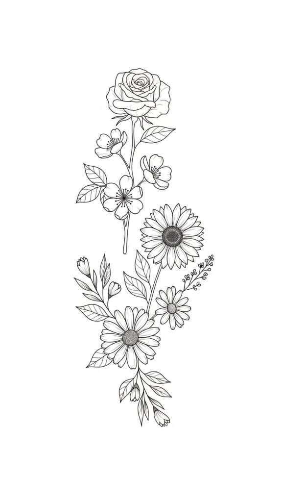 This design blends delicate fine line florals into a graceful, minimal composition—rose and vine as central anchor, cherry blossoms and tiny sunflowers providing movement, daisies and minimal leaves offering balance.