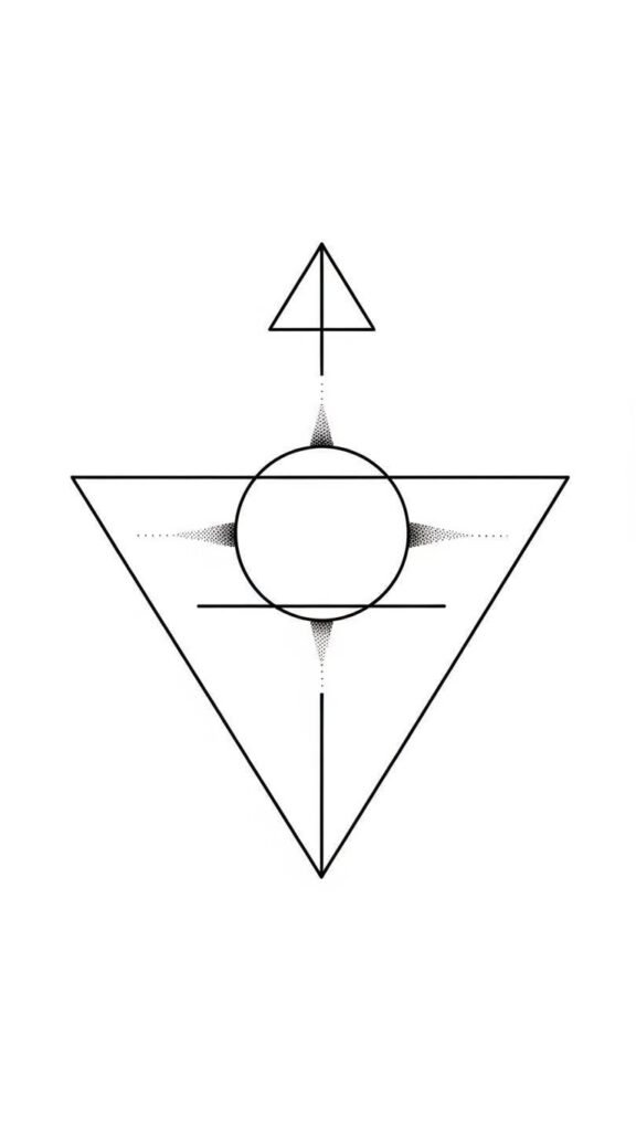 The design symbolizes unity (circle) tempered by direction and intent (vertical line) and outward growth or protection (triangles); it conveys calm confidence and deliberate balance. Emotionally it reads as serene and empowered—an emblem of clarity and self-possession.