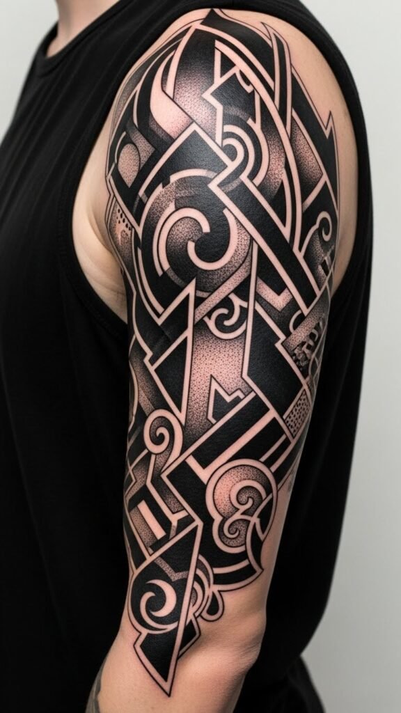 You’ll love how these tattoos elevate your style while embracing your free spirit. The design symbolizes the balance between structure and freedom—solid blocks for resilience, flowing swirls for intuition, and negative space for possibility—evoking empowerment and mystery; ideal placed as an upper arm wrap extending onto the shoulder and chest to follow muscular contours and maintain visual flow.