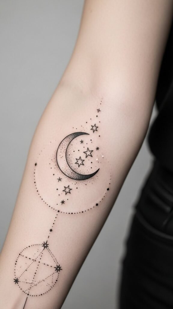 This tattoo symbolizes guidance, cycles, and personal navigation through change—crescent moon for intuitive growth, stars for hopes and milestones, and the dotted arc as the passage of time; it evokes calm wonder and quiet resolve.