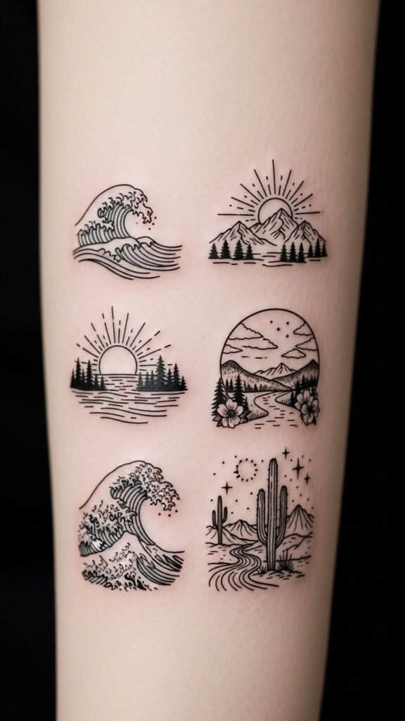 These tiny tattoo concepts symbolize calm, resilience, and a lifelong bond with nature; waves speak to emotional flow and adaptability, mountains to strength and endurance, forests to growth and mystery, while sunsets and starry skies evoke wonder and introspection.