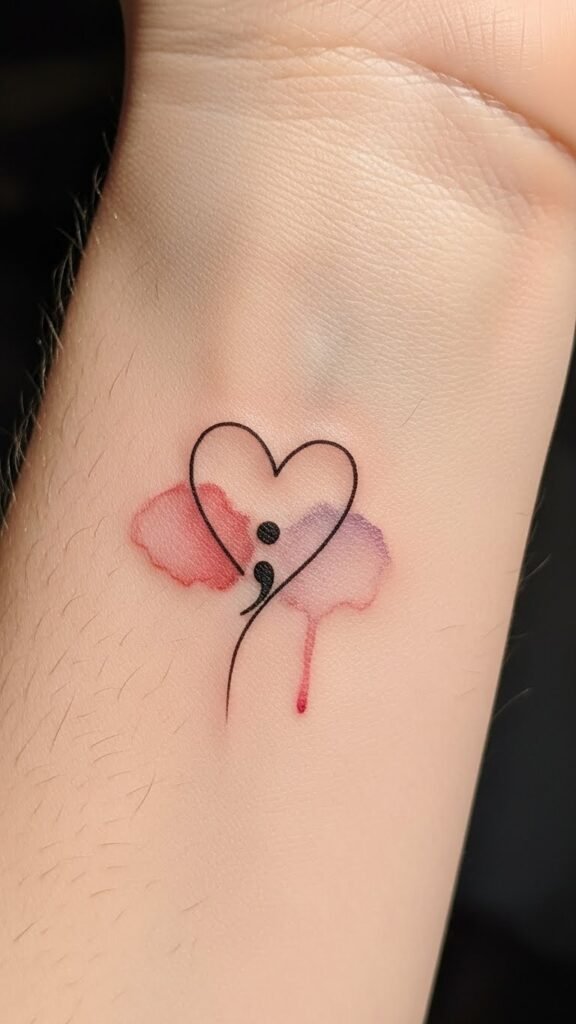 These tattoos, small yet powerful, can beautifully express your journey, embodying heart symbol meanings and semicolon tattoo significance in a way that resonates deeply with your spirit. The combined design merges tenderness and perseverance—place it where you can both see and feel it easily, such as the inner wrist for a daily reminder or behind the ear for a quiet, intimate statement; the soft watercolor wash adds warmth and vulnerability while the fine line keeps the piece elegant and timeless.