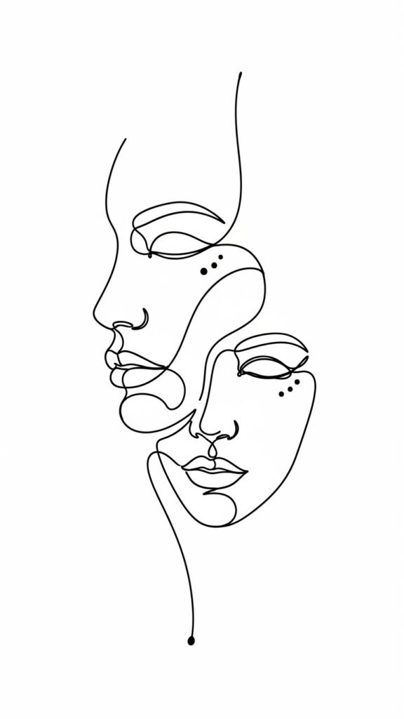 The overlapping faces symbolize connection and duality, the single continuous line conveys unity and flow, and the small dot accents draw attention to focus and awareness; emotionally the design feels serene and introspective, lending itself to intimate placements like the wrist, behind the ear, inner forearm, or collarbone where its delicate nature can be easily seen and cherished.