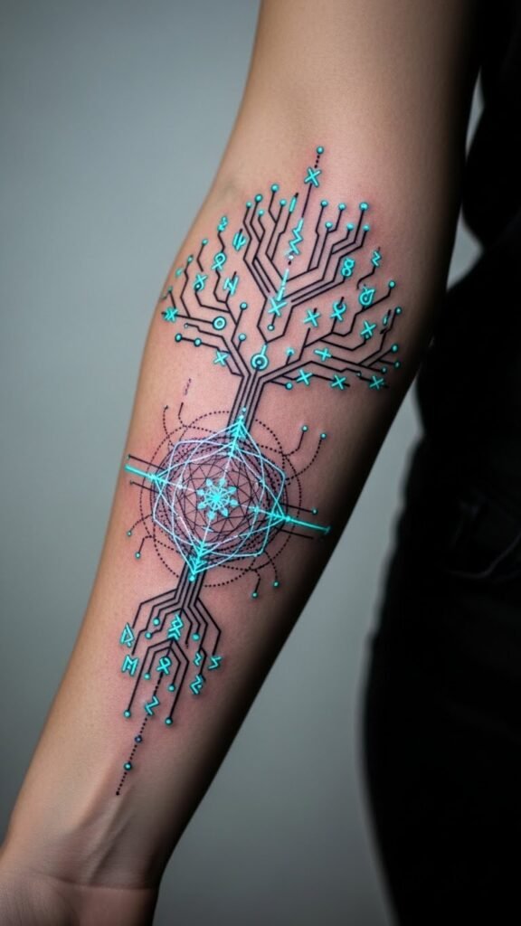 Emotionally it conveys empowered calmness and a sense of belonging to both future and ancient traditions. Ideal placement is along the inner forearm for visibility and intimacy, wrapping slightly toward the wrist to let the glowing elements animate with movement; scale can be adjusted for shoulder blade, calf, or chest to maintain the same symbolic flow.