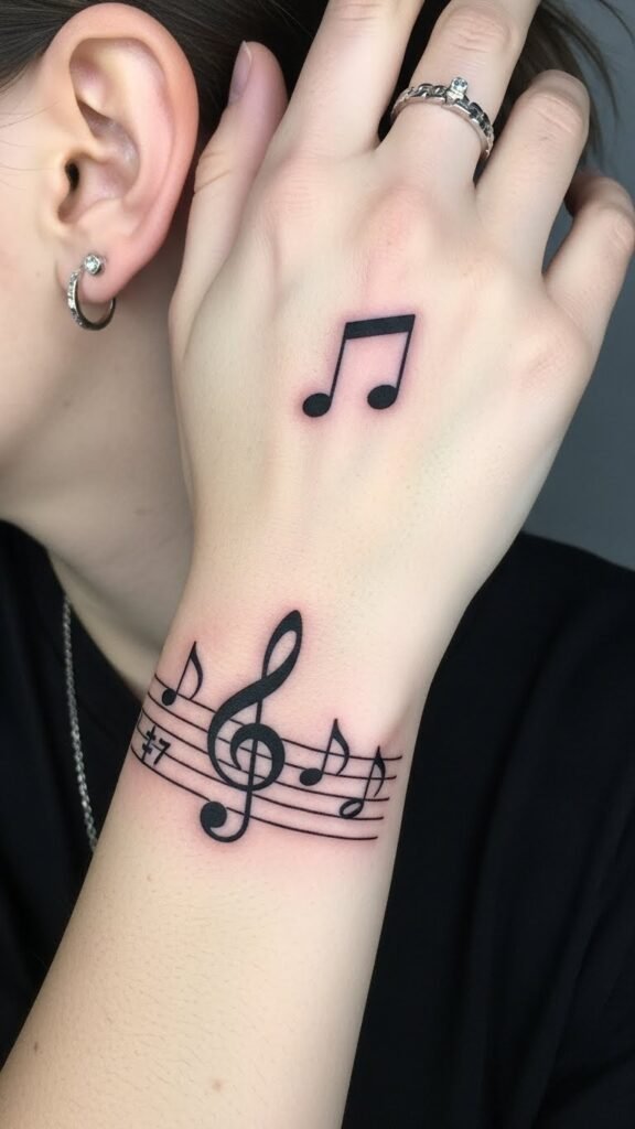 The design pairs a single, cleanly inked eighth note with a faint, circuit-like sigil halo—thin geometric lines suggesting connectivity—rendered in fine black lines with optional soft gray shading; placed behind the ear it reads as a private talisman of identity, on the wrist it becomes a quiet statement of passion.