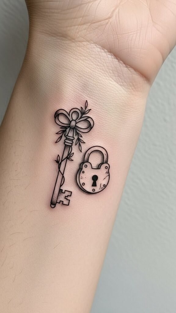 While tiny key and lock tattoos may seem simple, they often hold deep personal significance. These designs embody key symbolism, representing accessible potential and new beginnings. The lock carries meanings of protection and cherished secrets. When you wear one, it’s a celebration of freedom—your unique story, waiting to be discovered. Embrace this art, and let it speak to your adventurous spirit!