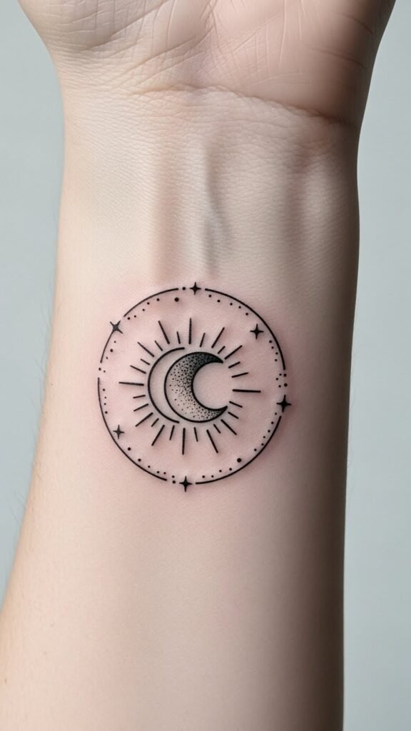 The design emphasizes harmony and contrast—bright rays against soft stippling—to evoke calm resilience and personal transformation; ideal placements are wrist, behind the ear, ankle, or inner forearm where the intimate scale and linear detail read clearly and feel personal.