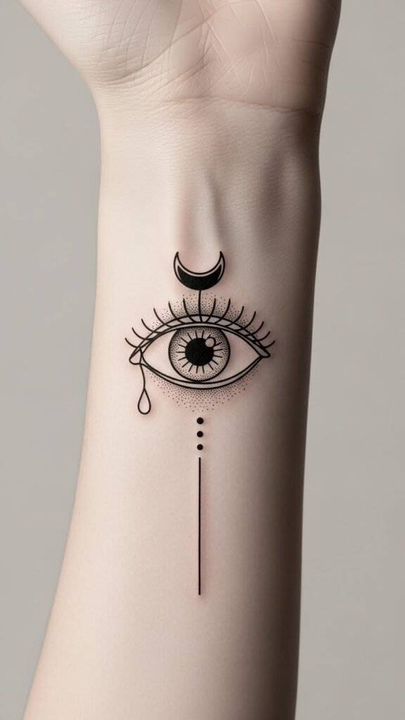 This design emphasizes quiet strength and inner sight—the crescent suggests cyclical growth while the dots mark focus points of intention; placed on the wrist it feels like a private talisman, behind the ear it whispers secrecy, and on the ankle it hints at grounded protection, all evoking calm confidence and guarded openness.