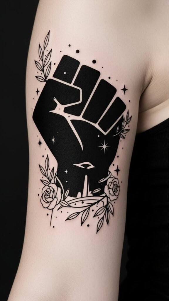 The design blends stark defiance (the solid fist) with softer elements (roses and laurel leaves) to symbolize victory, remembrance, and the ongoing struggle; its minimalist execution evokes clarity and permanence while the placement on the upper forearm or outer shoulder allows visibility for personal affirmation and public solidarity, conveying pride, resilience, and a call to communal empowerment.