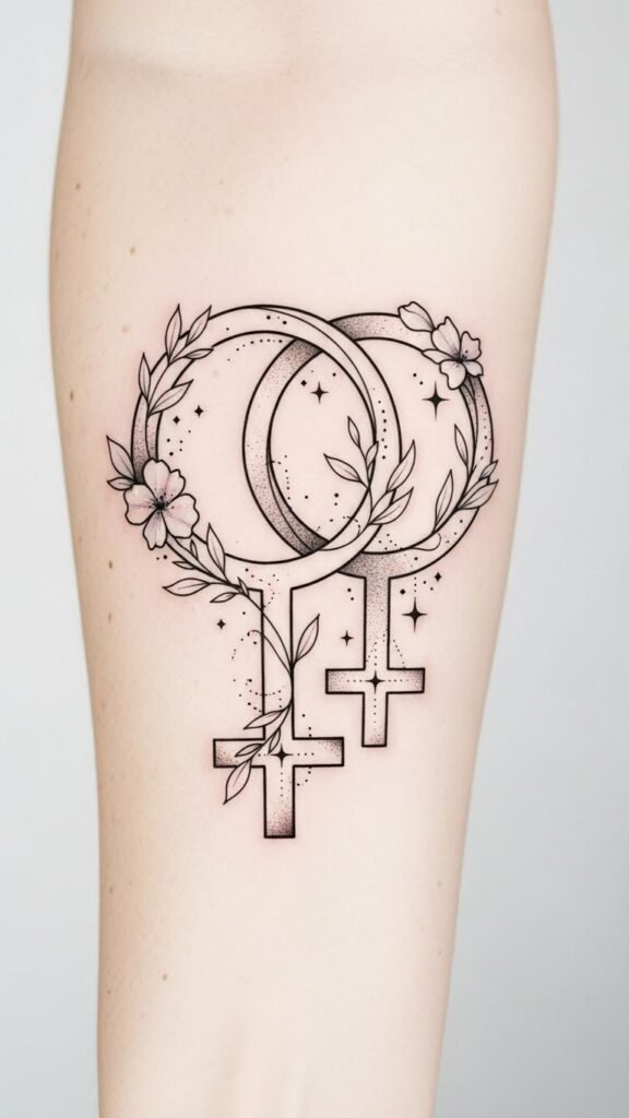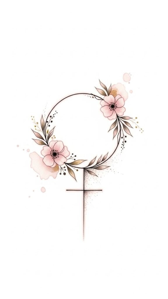 A small tattoo of the Venus sign can serve as a daily reminder of your unique journey, empowering you to express your authentic self and revel in your femininity. The added floral wreath and watercolor tones emphasize growth, grace, and warmth; the fine line and dotwork convey intimacy and resilience.