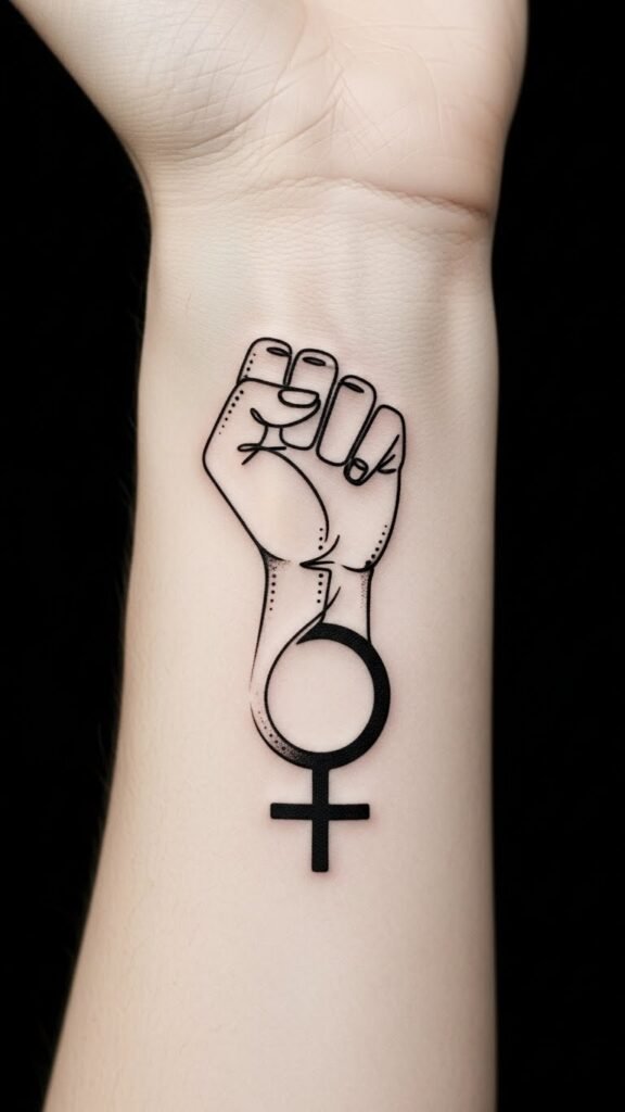 The raised fist merged with the Venus sign symbolizes collective strength and personal empowerment—its single-line execution conveys resilience distilled to its essence, while the delicate dotwork adds quiet affirmation.
