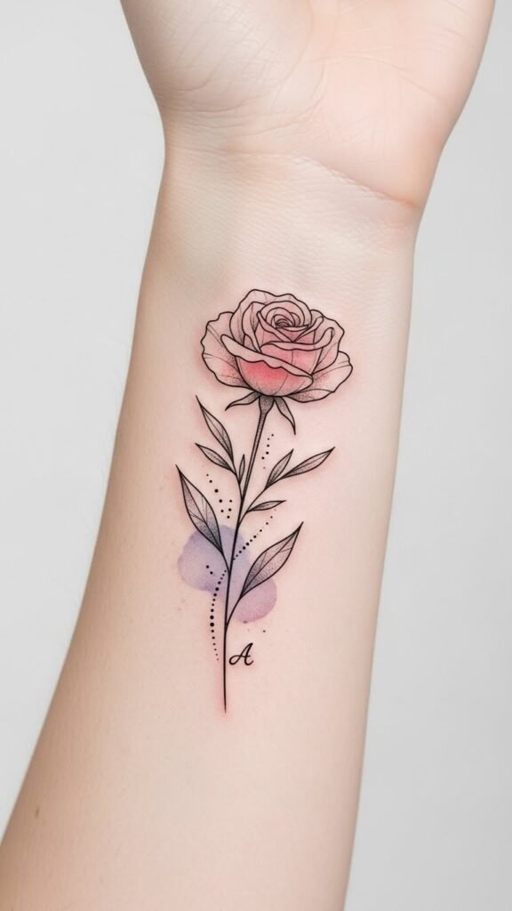 Soft lines and watercolor hints convey tenderness and resilience, while the hidden initial makes it uniquely yours, suitable for wrists, behind the ear, ribcage, or ankle to balance visibility and privacy.