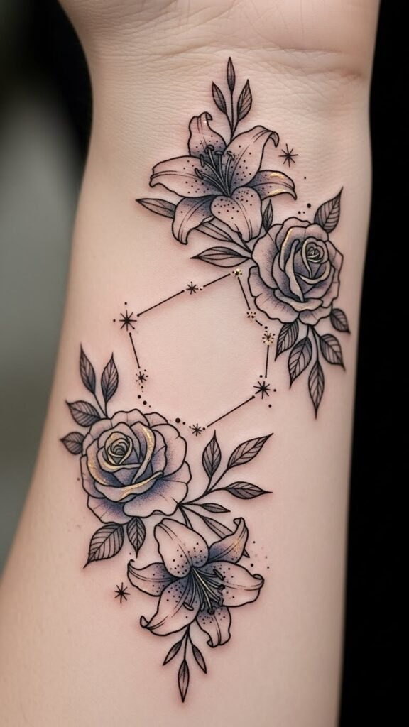 Building on the idea of personalized tattoos, zodiac-inspired floral motifs blend celestial significance with nature’s beauty, creating a unique expression of your identity.