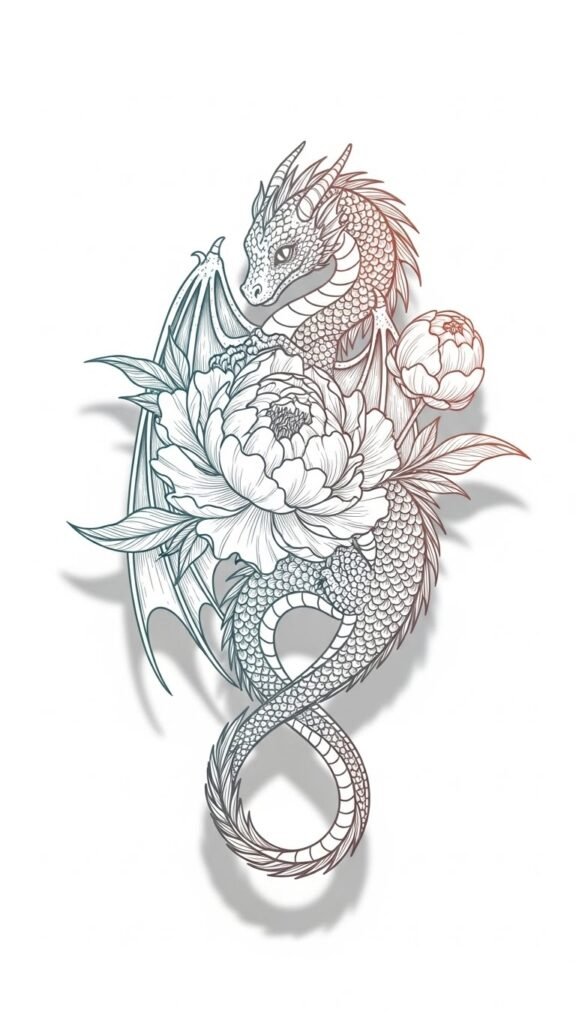 The composition pairs the dragon’s protective curl with a peony symbolizing beauty and rebirth, conveying resilience tempered by softness; muted teal and rose gold tones evoke calm confidence and warmth, while the infinity-shaped tail suggests enduring empowerment.