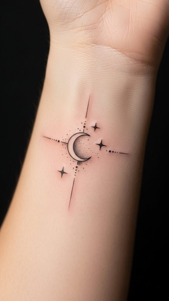 This wrist placement keeps the piece intimate and visible, the fine dotwork and watercolor wash conveying subtle emotion and a sense of connection to the cosmos; the crescent moon and planetary accents symbolize inner guidance and life phases, while the negative-space glyph anchors the design as a personal signature.