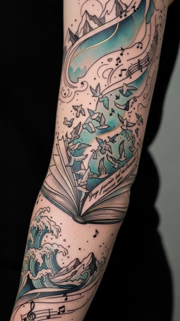 The design weaves the original idea of a personal journey into a visual narrative: the open book symbolizes lived stories, pages turning into birds convey freedom and transformation, waves and mountains represent emotional depths and challenges, musical notes echo the harmony of memory, and the cursive quote offers a private anchor.