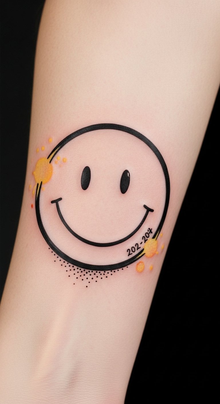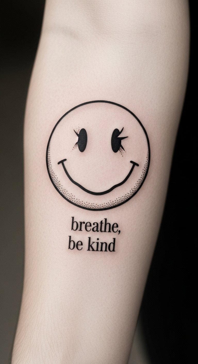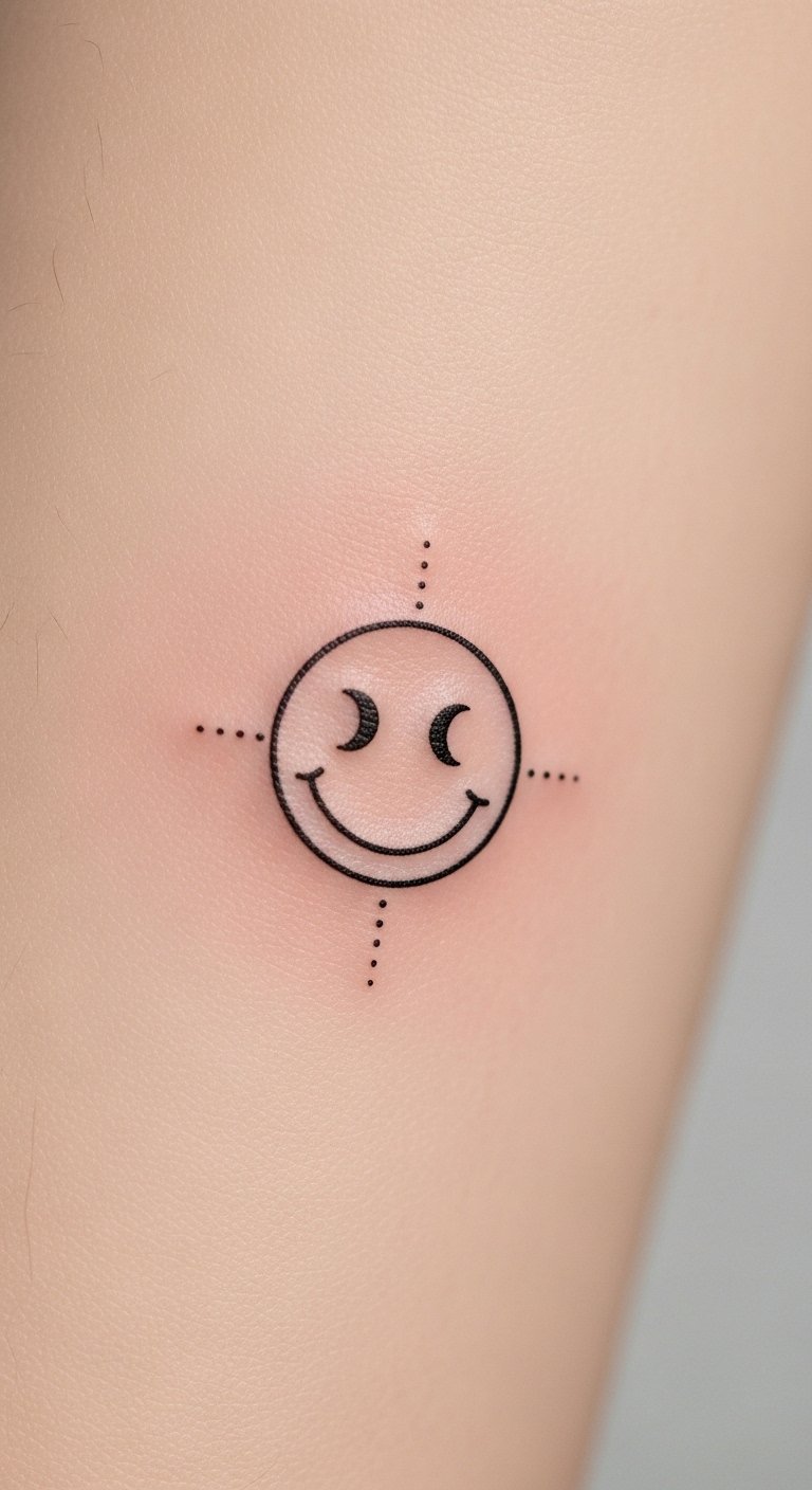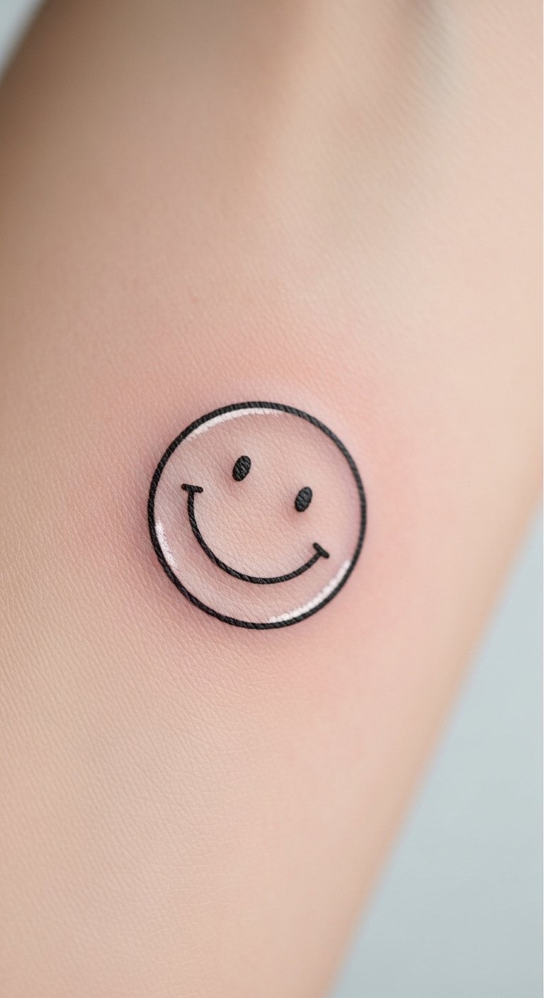 This smiley tattoo concept blends minimal linework with soft shading to evoke warmth and optimism; placed on the wrist it offers a discreet, personal talisman, on the ankle it reads as lighthearted and spontaneous, and on the shoulder it becomes a confident, visible statement.