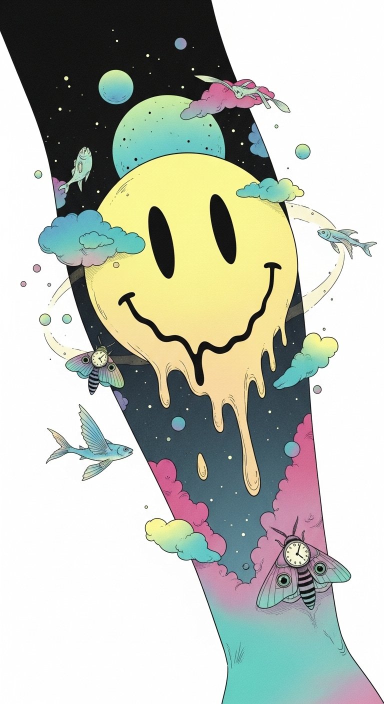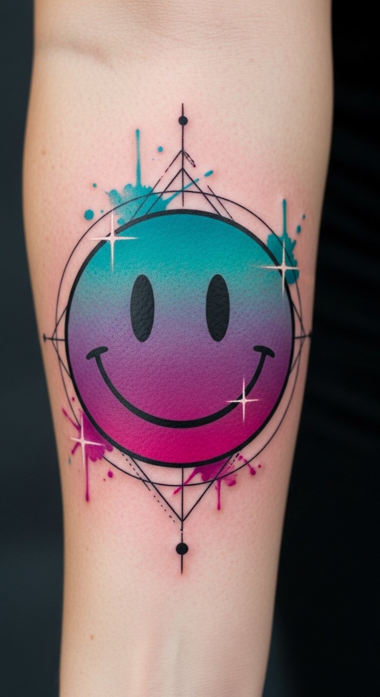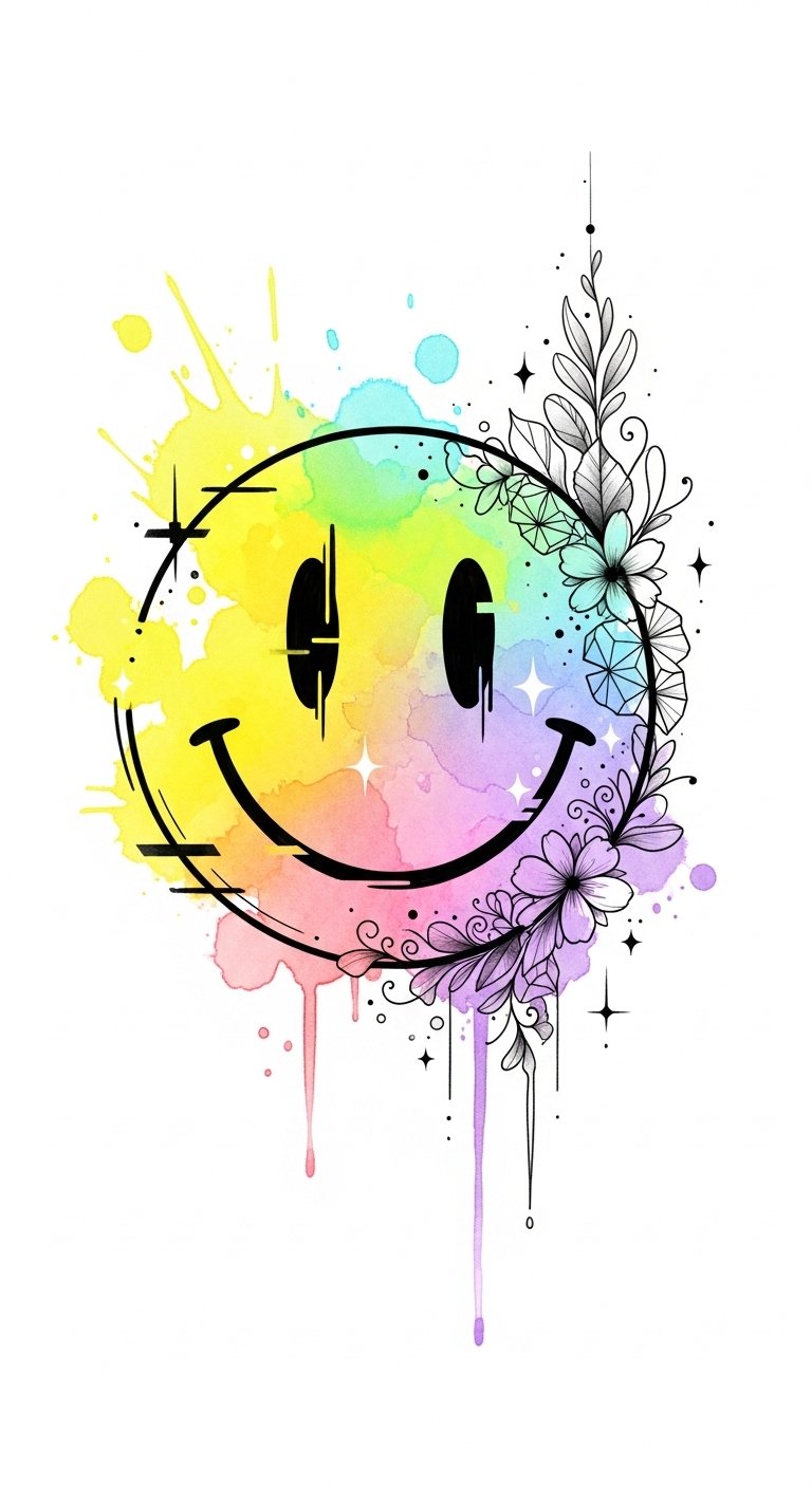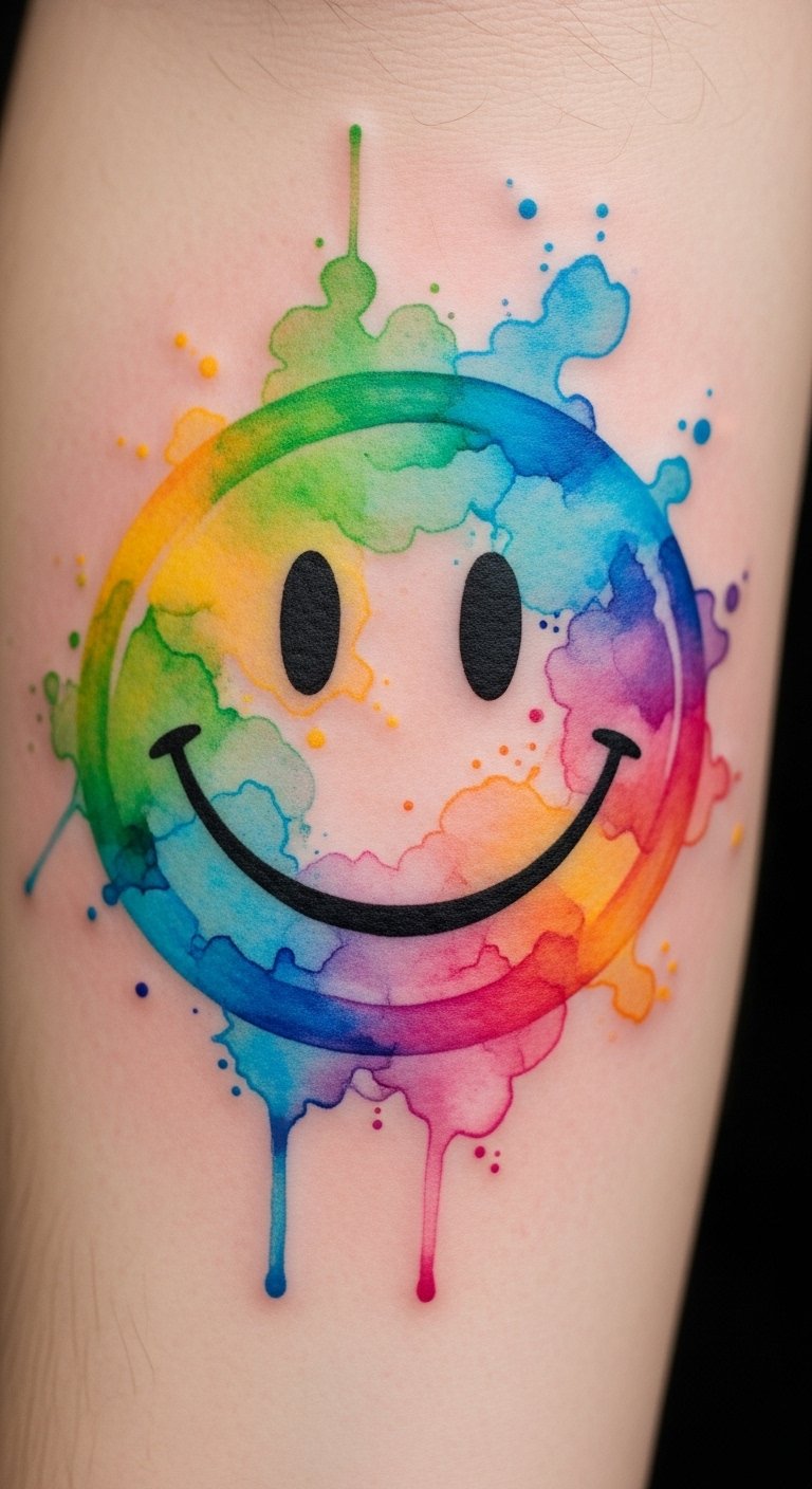 Place this design on the forearm, shoulder blade, or ankle where the flowing colors can follow natural contours; the watercolor washes symbolize emotional fluidity, the smiley face anchors playful resilience, and the blended palettes suggest personal complexity beneath a joyful surface.