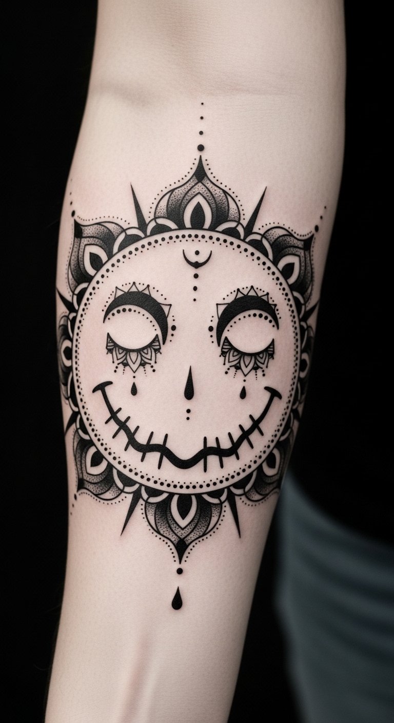 If you’re drawn to a classic aesthetic, timeless blackwork smiley designs offer a striking contrast to their colorful counterparts.
