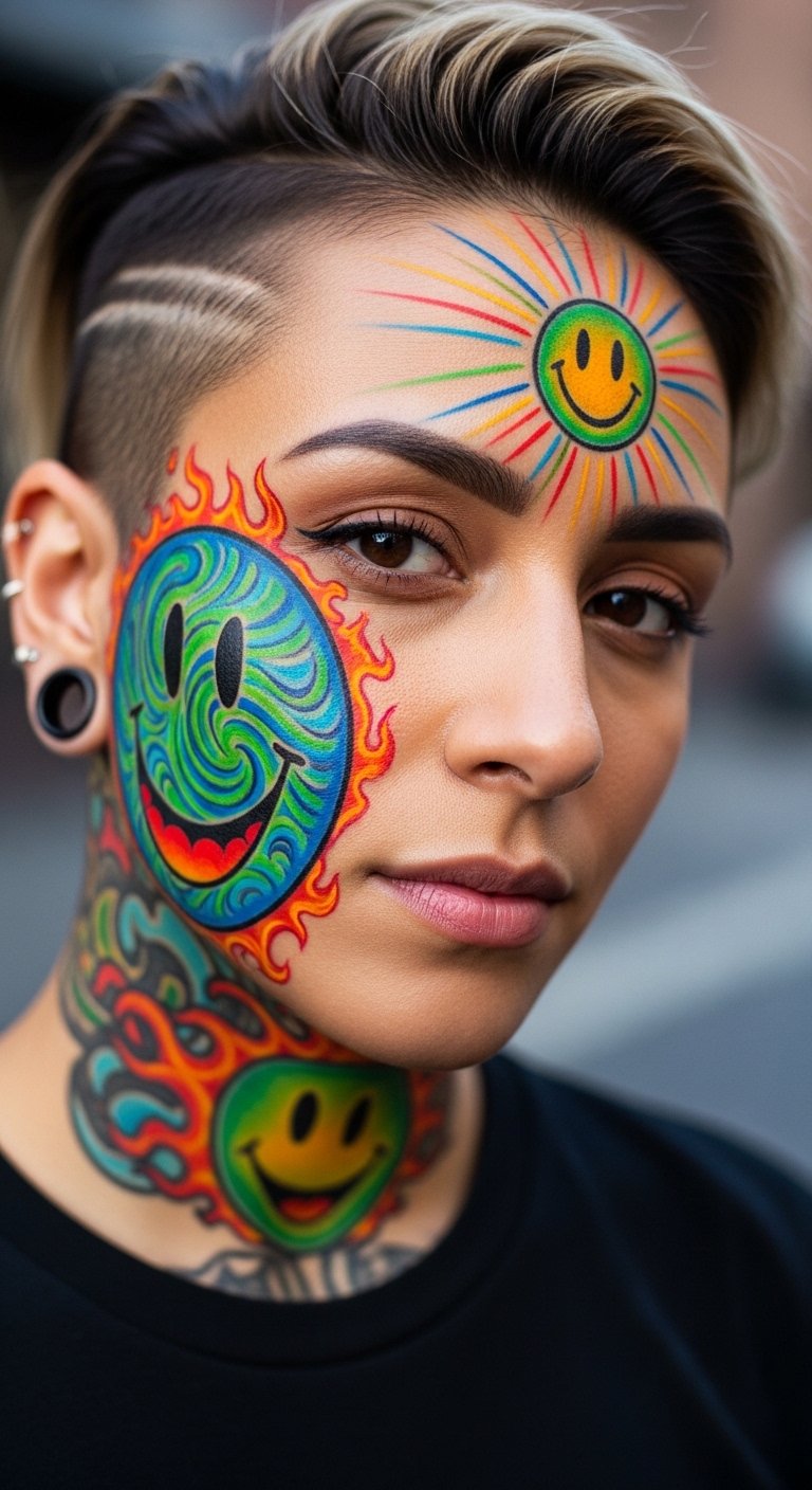 Bold facial placements for smiley face tattoos in vivid, saturated hues emphasize individuality and symmetry; a cheek placement follows natural contours to accent smiles, while a forehead placement becomes a frontal emblem of openness.