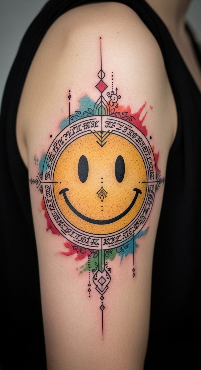 This design melds the timeless optimism of the smiley with layered historical motifs to symbolize continuity of human emotion; the watercolor hues represent cultural diversity and shared joy, the filigree and tribal details evoke ancestral ties, and the placement on the forearm or shoulder allows the wearer to both display and carry this universal emblem—visible as a personal reminder and outward sign of connection.