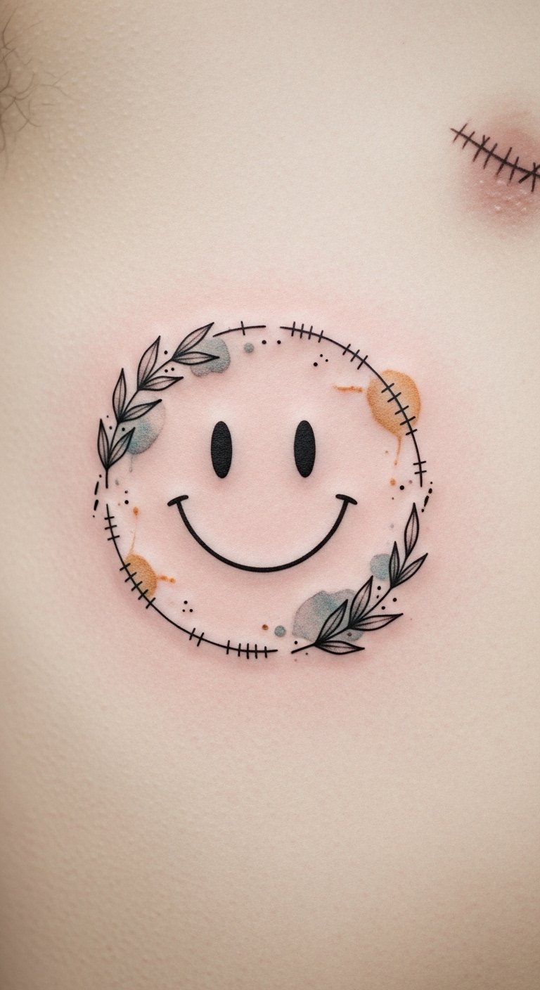 By inking a smiley face tattoo, you celebrate your triumphs, reminding yourself that even in darkness, joy can shine through, empowering you to face each day with renewed strength and positivity. The broken circle represents past struggles and healing, laurel sprigs signify victory and growth, watercolor tones evoke the gentle restoration of emotion, and stitched scars acknowledge scars as part of the narrative.